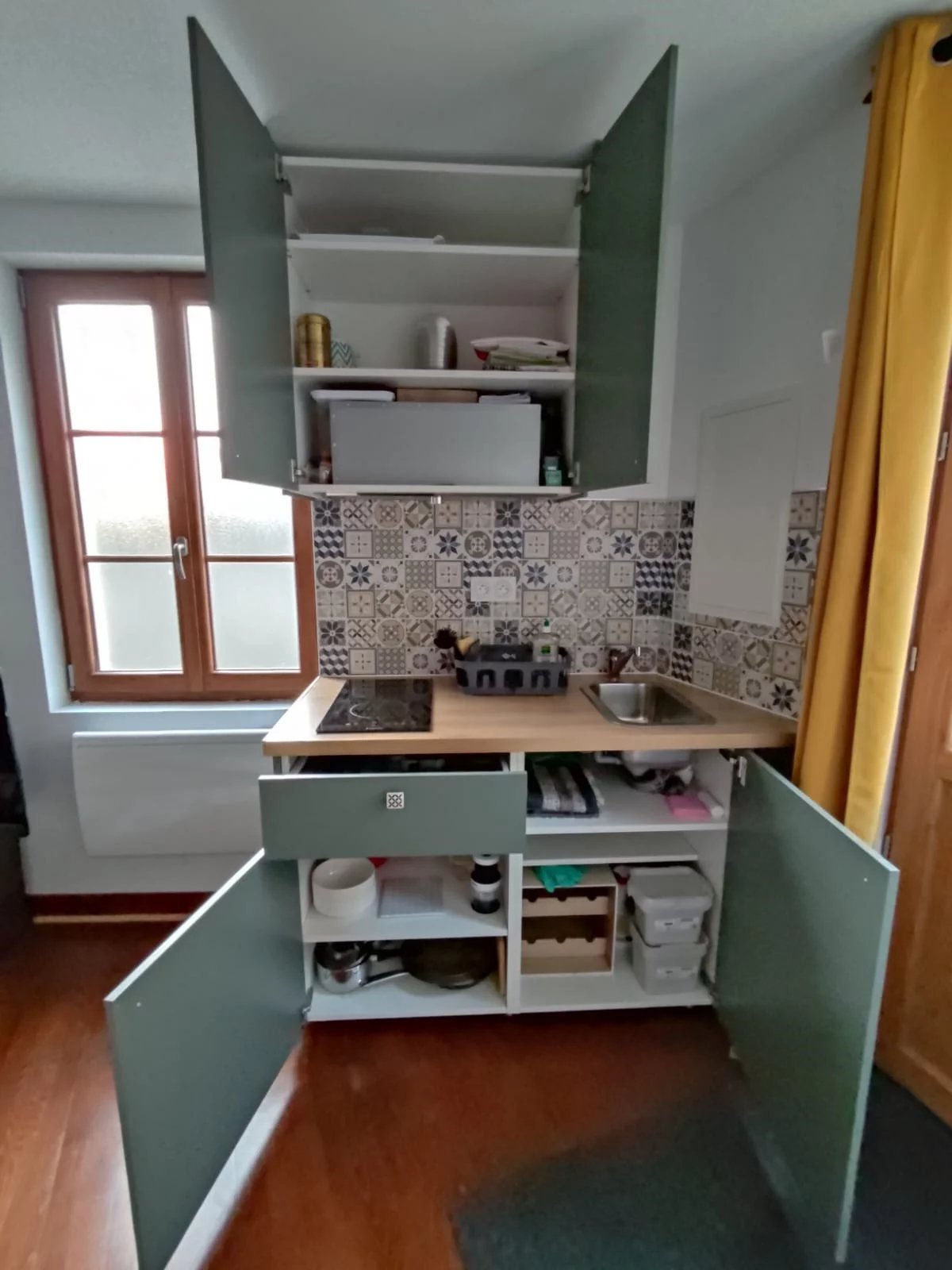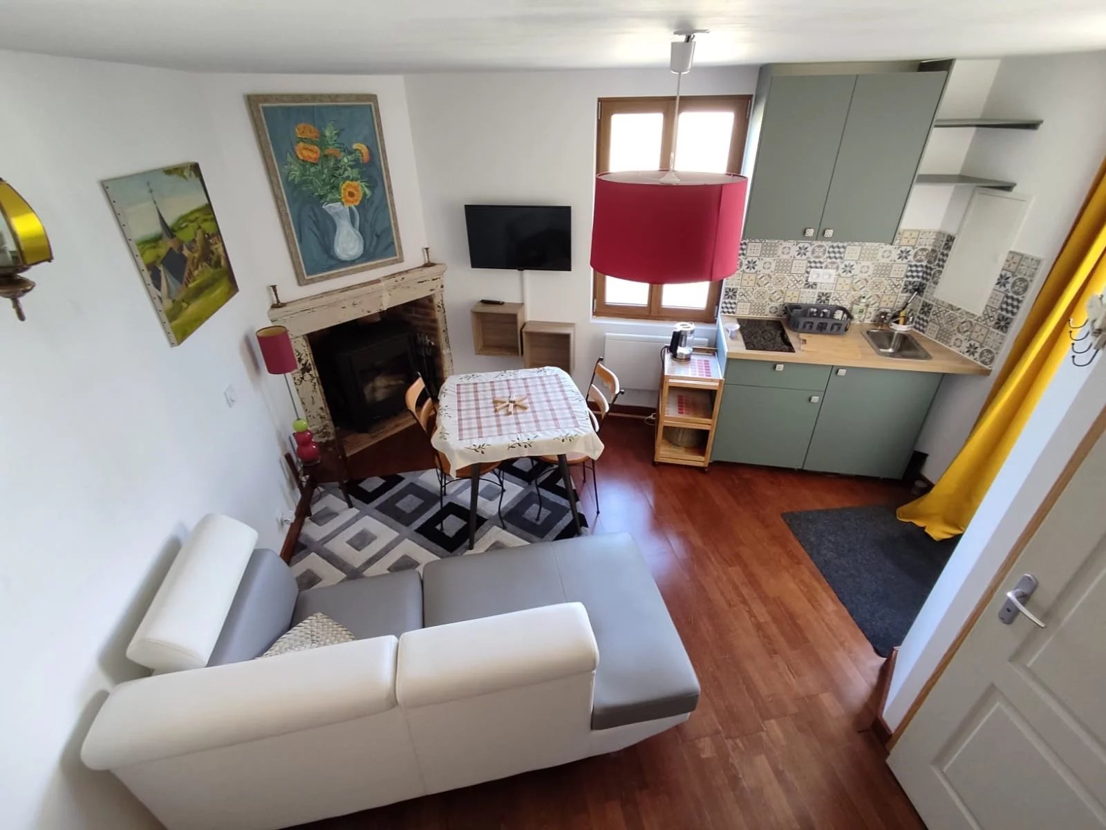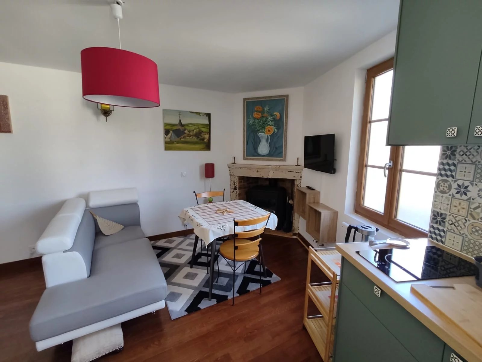 Maison offrant: séjour avec poêle à bois ouvert sur coin cuisine équipée, salle d'eau avec wc.