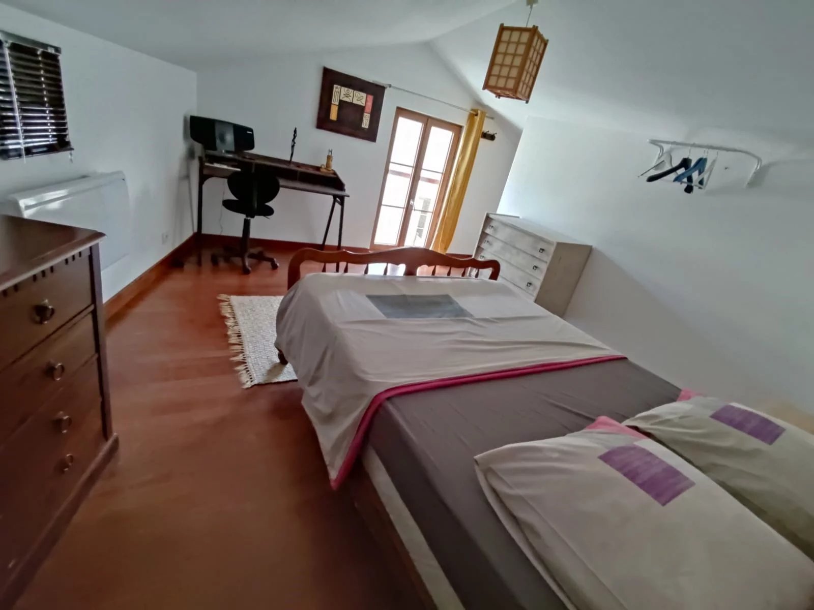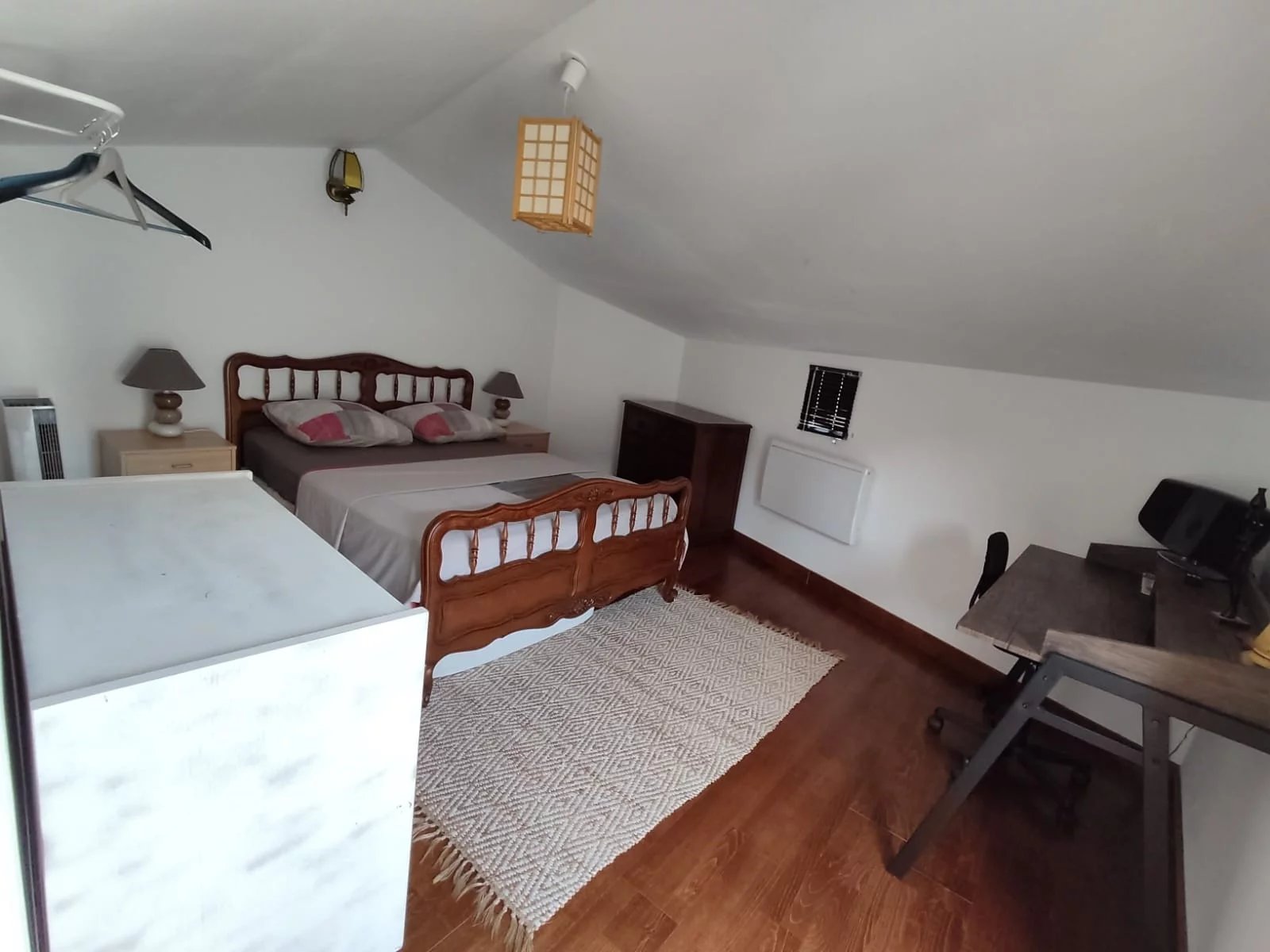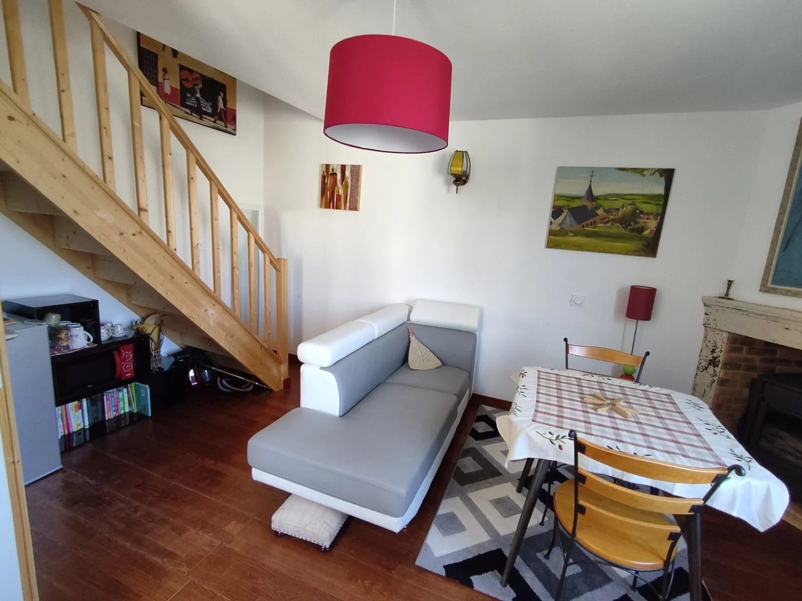 Maison offrant: séjour avec poêle à bois ouvert sur coin cuisine équipée, salle d'eau avec wc.